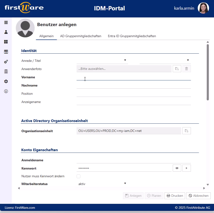 Automatische Generierung von Attributen im IDM-Portal: Durch das Ausfüllen des Namens werden der Anzeigename und Anmeldename automatisch befüllt – gemäß den Vorgaben der IT.