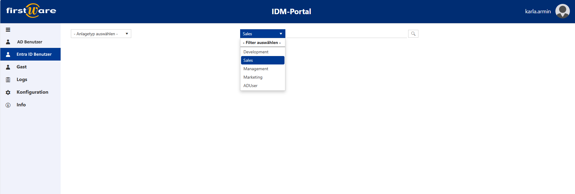Mit der Veröffentlichung von IDM-Portal 5.3 wurde das Benutzerinterface komplett modernisiert und benutzerfreundlicher gestaltet. Über die neue Suchfunktion lassen sich alle Objekte direkt finden, ohne zwischen mehreren Menüpunkten wechseln zu müssen – egal, ob es sich um AD Benutzer, Entra ID User oder andere Identitätstypen handelt.