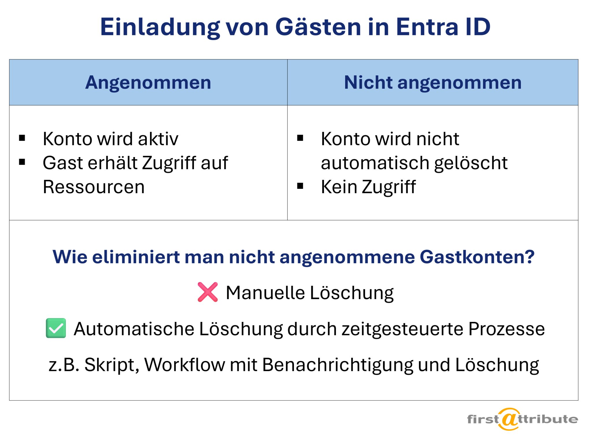 Das bedeutet, dass ein einmal erstellter Gastbenutzer in Entra ID bestehen bleibt – unabhängig davon, ob er die Einladung jemals annimmt. (Quelle: Microsoft-Dokumentation)