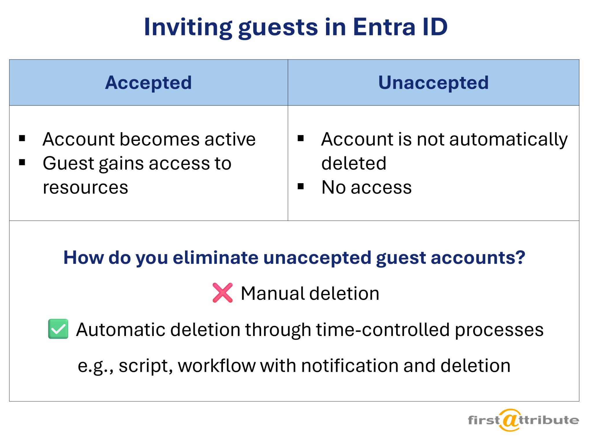 Unaccepted guest accounts do not disappear on their own. They remain in Entra ID as dormant objects and can thus impair clarity.
